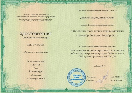 Категория: высшая категория с 27.12.2019 по 27.12.2024 Приказ № 316-01-63-2991 от 27.12.2019 Издал: Министерство образования Нижегородской области